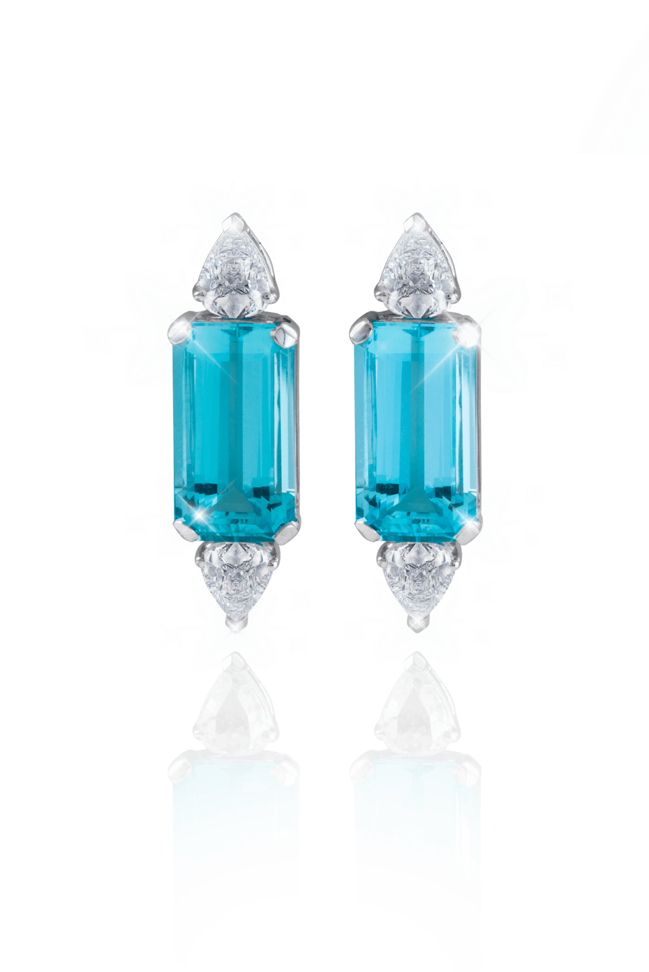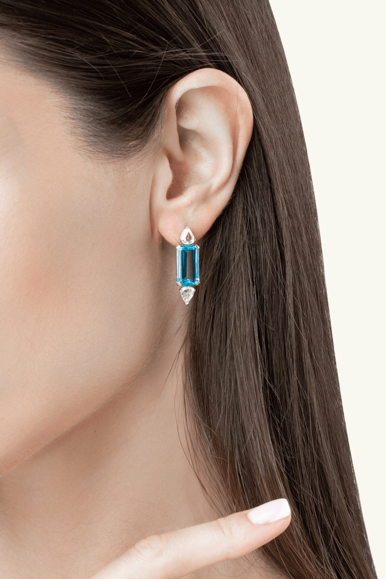 18K white gold diamond aquamarine green gemstone earring brings soft color and sparkle in one design. The light green aquamarine stone shines with a fresh, natural tone. Small white diamonds around the gem add extra brightness. The gold setting gives a clean and modern look.