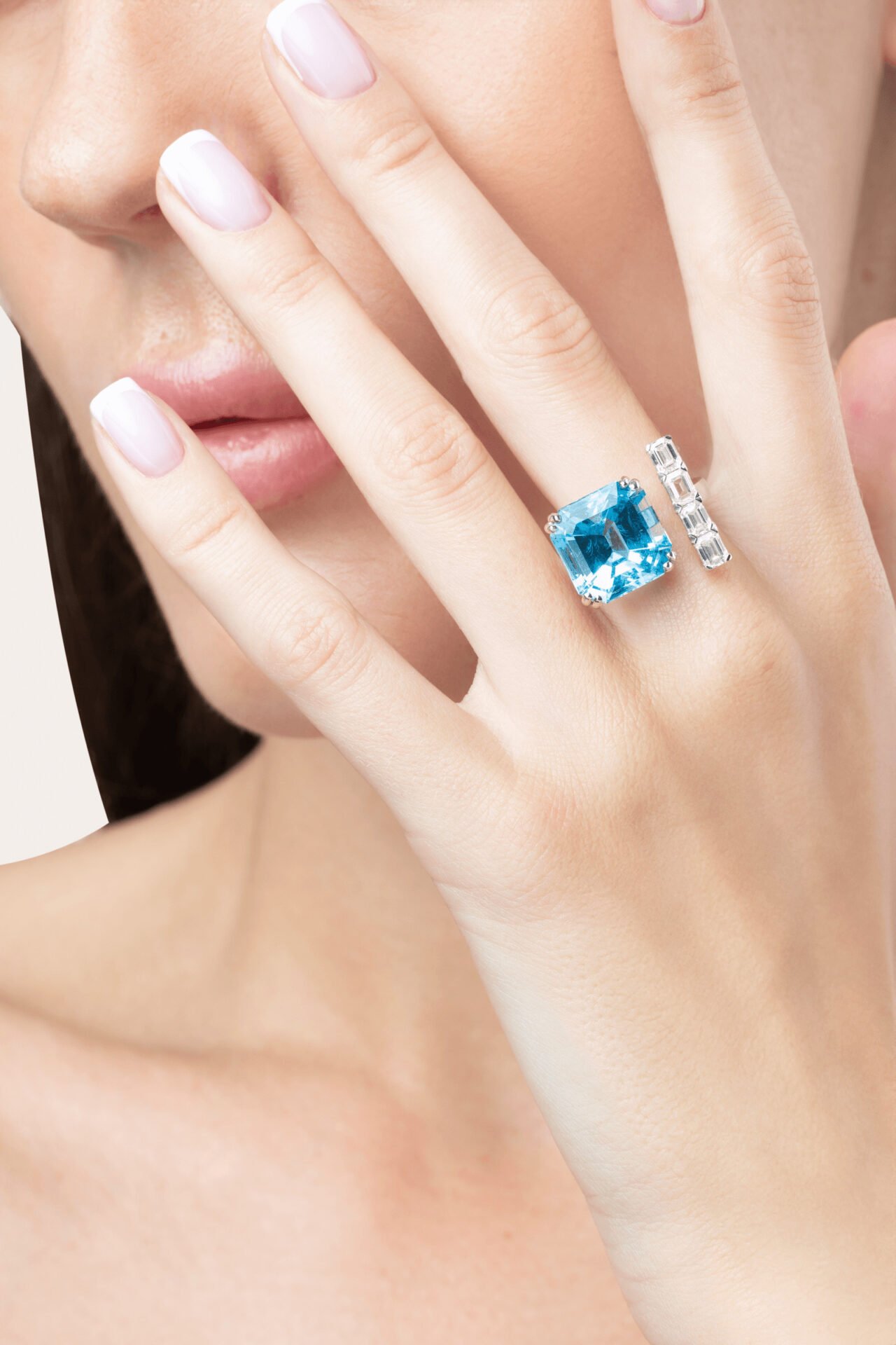 18K white gold diamond aquamarine octagon gemstone ring brings cool blue color and soft shine. The octagon-cut aquamarine sits at the center with a clear, ocean-like glow. Small diamonds line the sides to add sparkle and light. The shape of the stone gives a clean and modern look.
