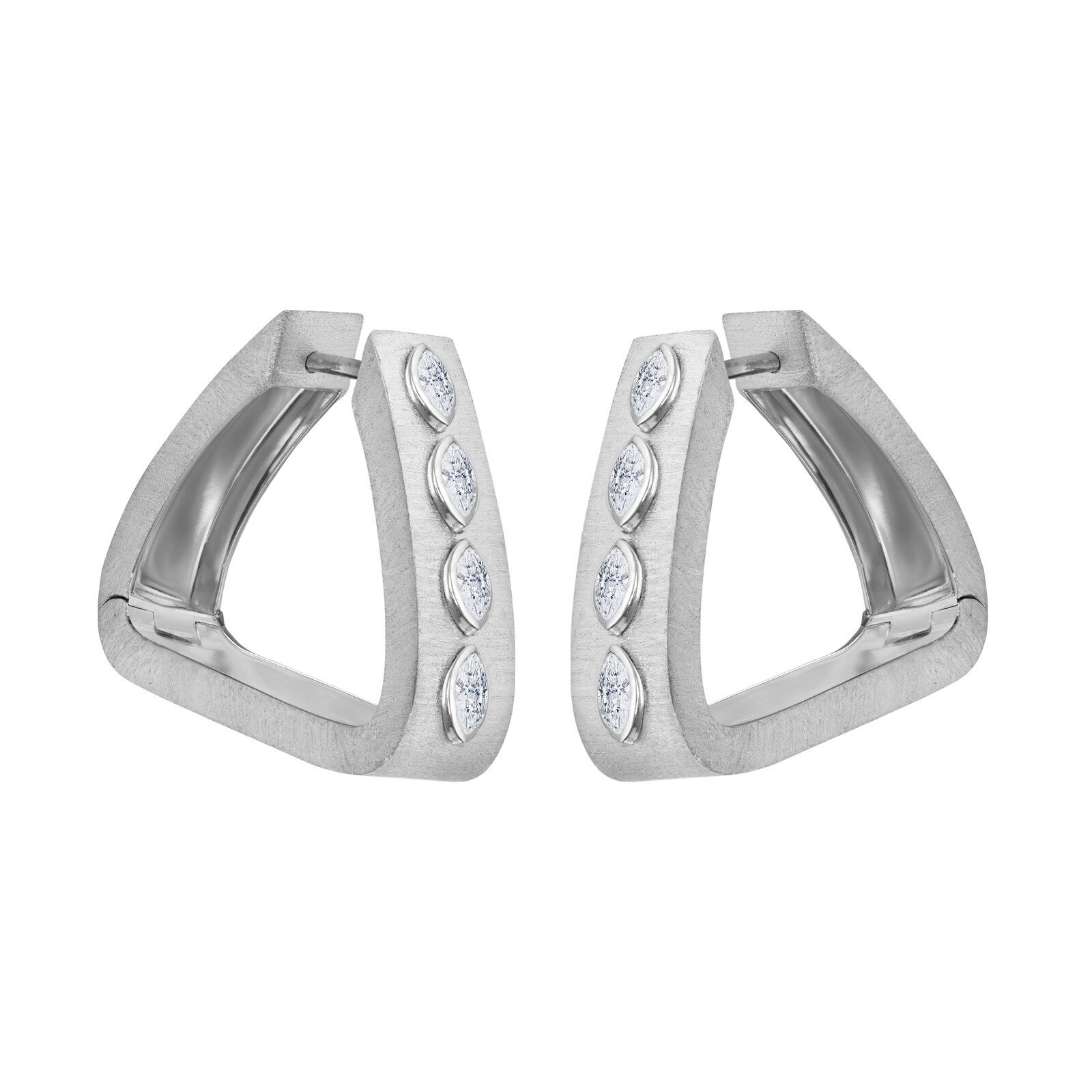 This small hoop earring is made with 18K white gold. It has a soft marquise brush texture that gives it a smooth and modern feel. A single round diamond sits at the center and adds a soft shine. The size is small and light, perfect for daily use.