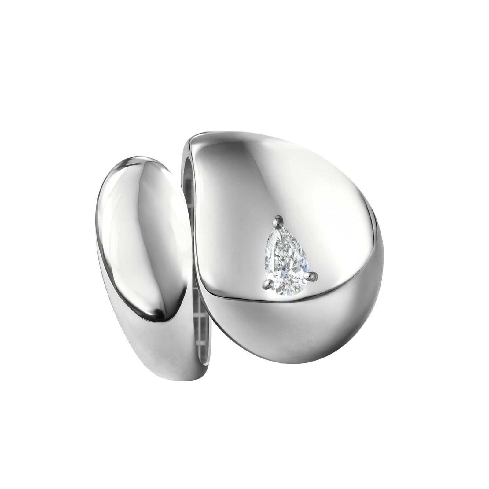 The 18K White Gold High Gloss Pear Diamond Ring by Maison H Jewels, from Roma, combines a polished sculptural finish with a pear-cut diamond.