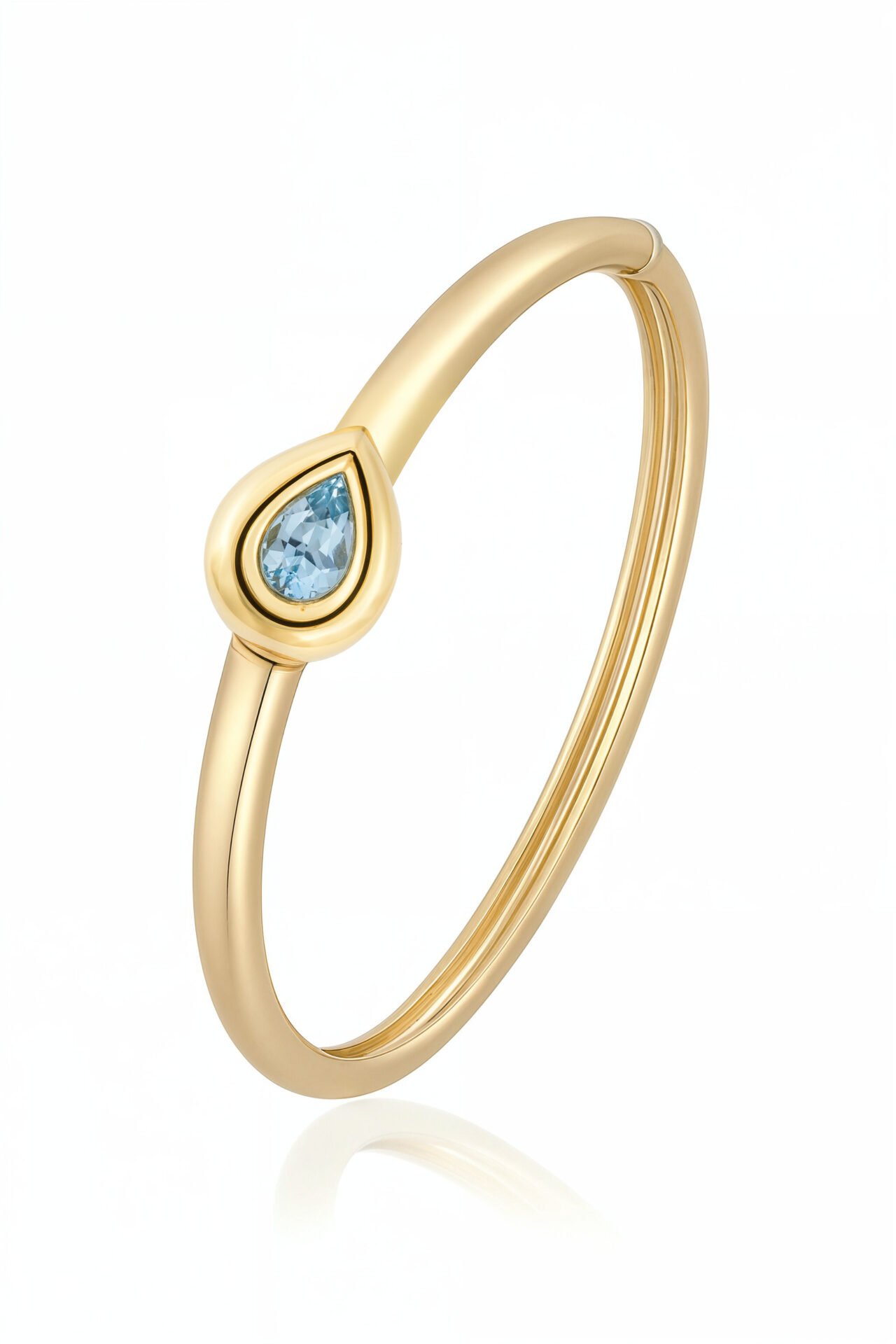 The 18K Yellow Gold Aquamarine Pear Bangle features a refined open bangle design highlighted by a pear-shaped aquamarine set in polished 18K yellow gold. The smooth, minimalist silhouette enhances the serene blue hue of the aquamarine, creating a sophisticated balance of modern elegance and timeless appeal. A versatile piece designed for effortless everyday wear and special occasions.