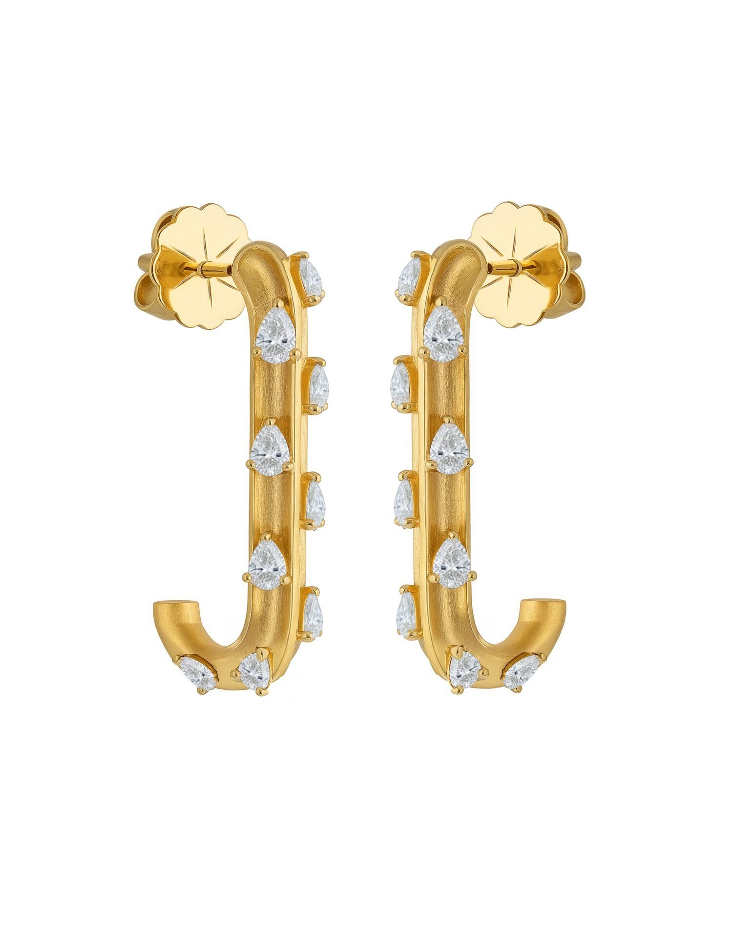 Elevate your style with the 18K Yellow Gold Diamond Earrings from the Skin Collection. These earrings feature a sleek J-shaped design adorned with sparkling pear-cut diamonds, combining modern minimalism with luxurious craftsmanship