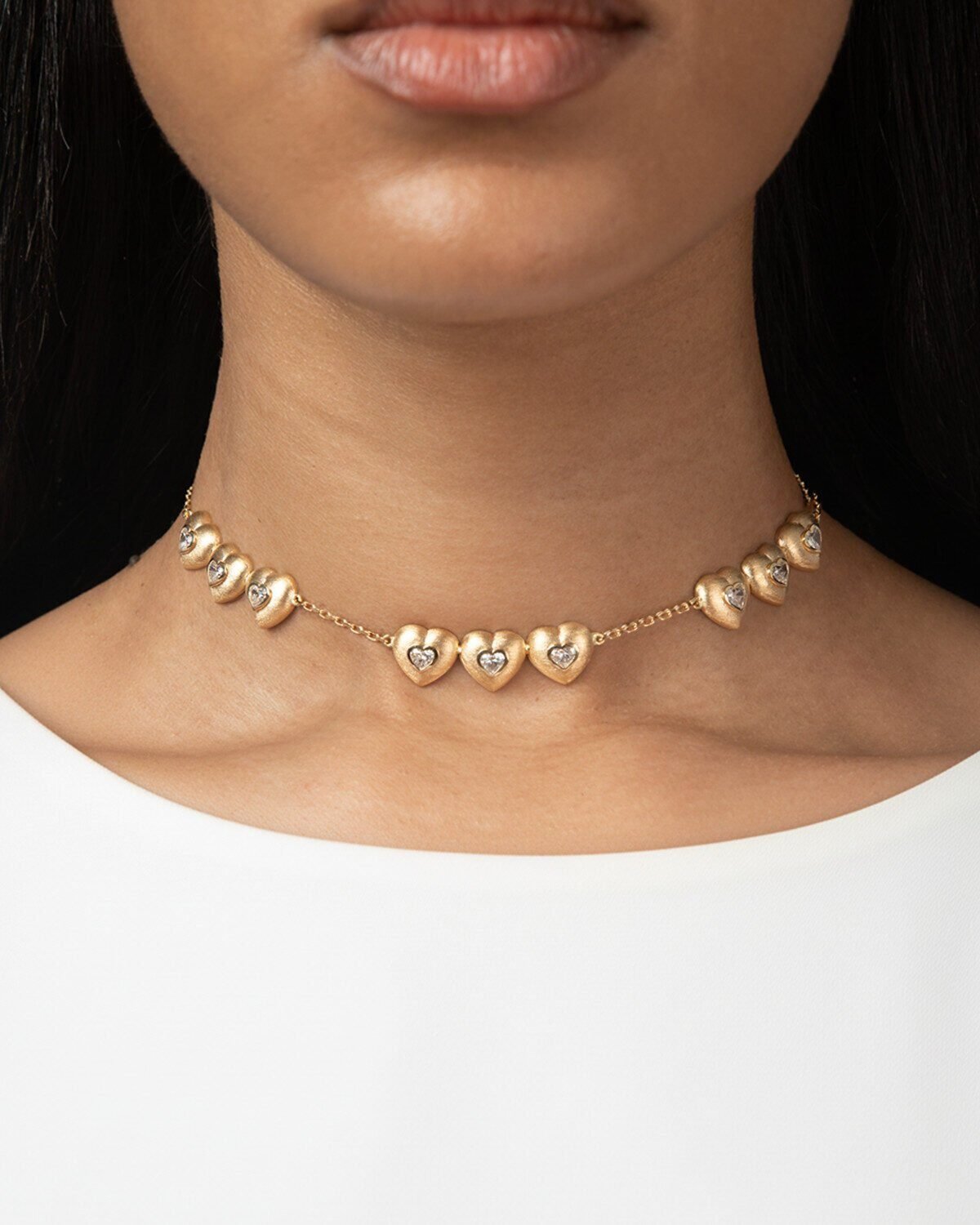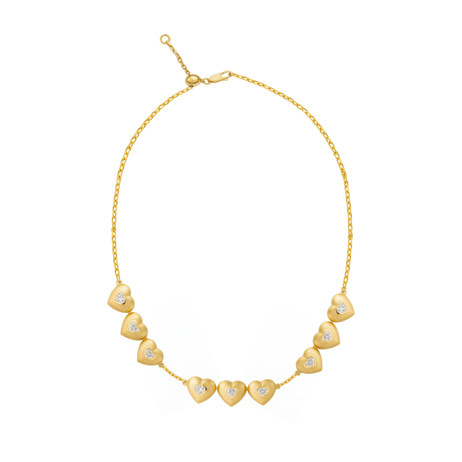 The 18K Yellow Gold Diamond Heart Necklace by Maison H Jewels, from Roma, features brushed hearts with brilliant diamonds in a romantic design.