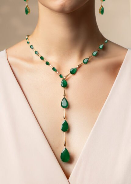 This 18K yellow gold diamond necklace from Maison H Jewels brings fresh color and natural beauty. The deep green emerald shines softly in the center. It hangs on a fine yellow gold chain that feels smooth on the skin.