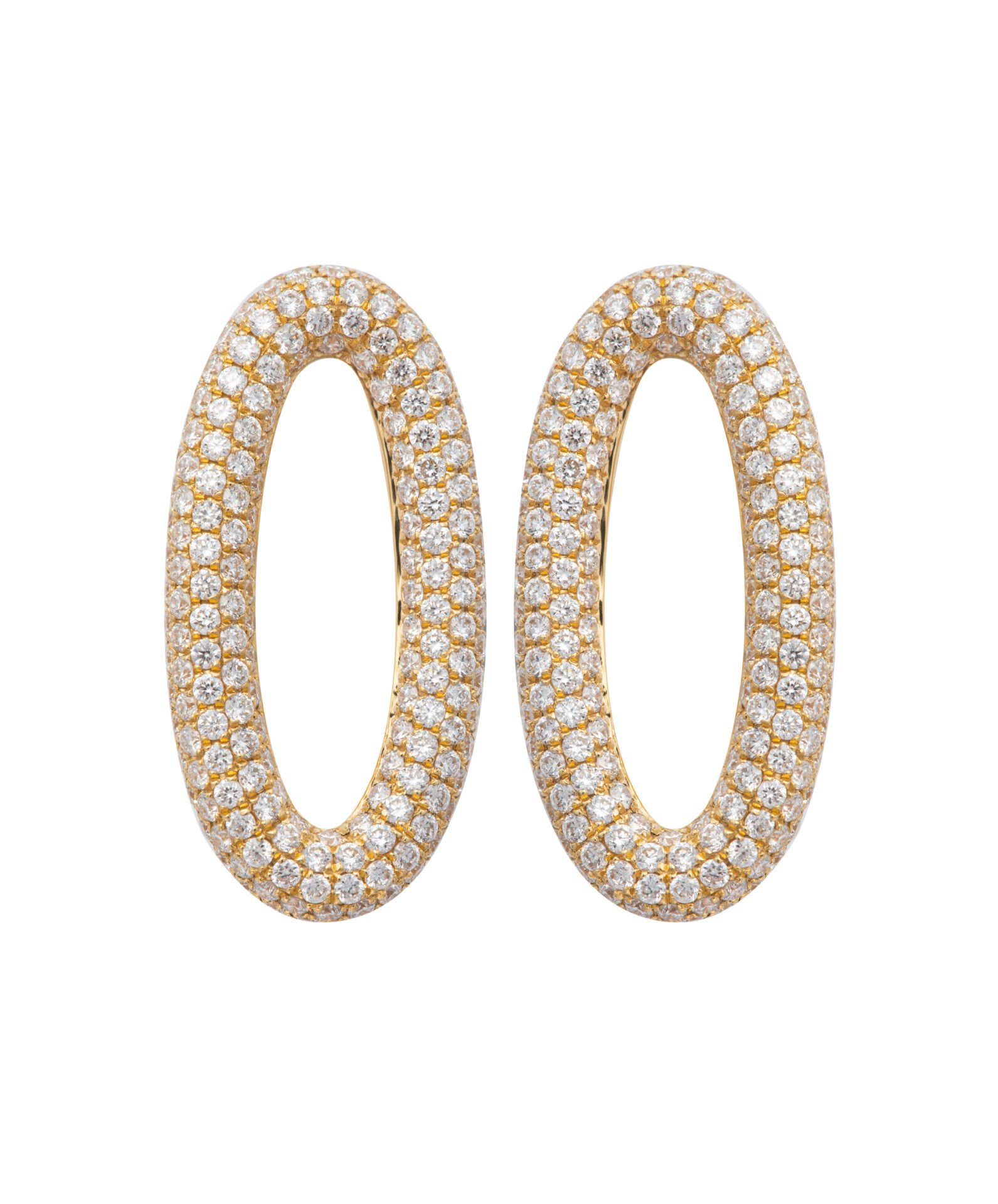 The 18K Yellow Gold Diamond Pavé Oval Earrings are a refined expression of modern elegance. Crafted in luxurious 18K yellow gold, each earring features a bold elongated oval silhouette fully adorned with meticulously set round brilliant diamonds.