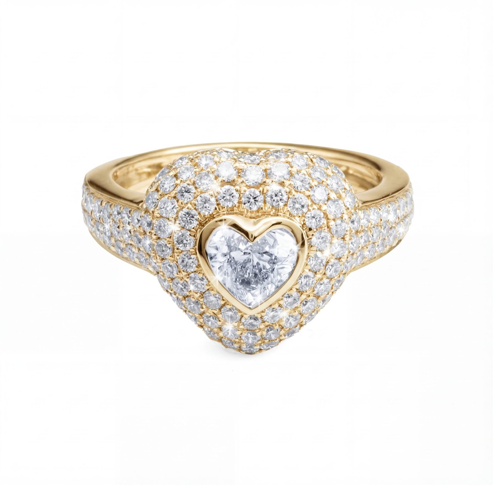 The 18K Yellow Gold Heart-Shaped Diamond Pavé Ring showcases a striking pear-cut centre diamond surrounded by a radiant pavé-set diamond halo. The diamond-encrusted band enhances brilliance from every angle, while the warm yellow gold setting adds timeless elegance. Designed for refined luxury, the 18K Yellow Gold Heart-Shaped Diamond Pavé Ring is perfect as a statement ring, engagement ring, or heirloom piece.