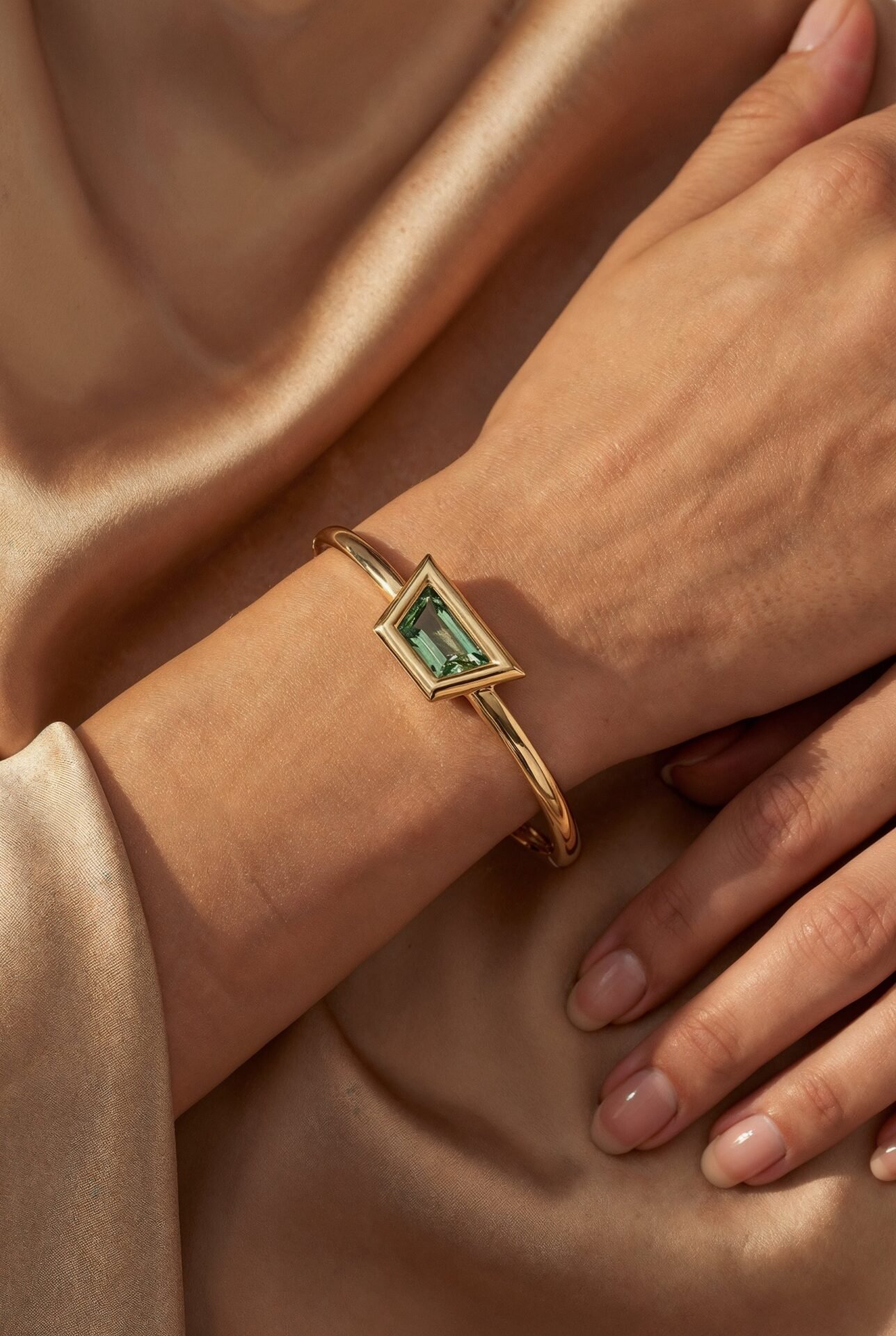 The 18K Yellow Gold High Gloss Green Tourmaline Triangle Bangle features a refined open bangle silhouette accented with a triangular-cut green tourmaline set in a smooth bezel. The high gloss finish enhances the warm yellow gold tone, while the geometric triangle setting adds a bold contemporary edge. Designed for modern elegance, the 18K Yellow Gold High Gloss Green Tourmaline Triangle Bangle is ideal for everyday luxury and statement styling.