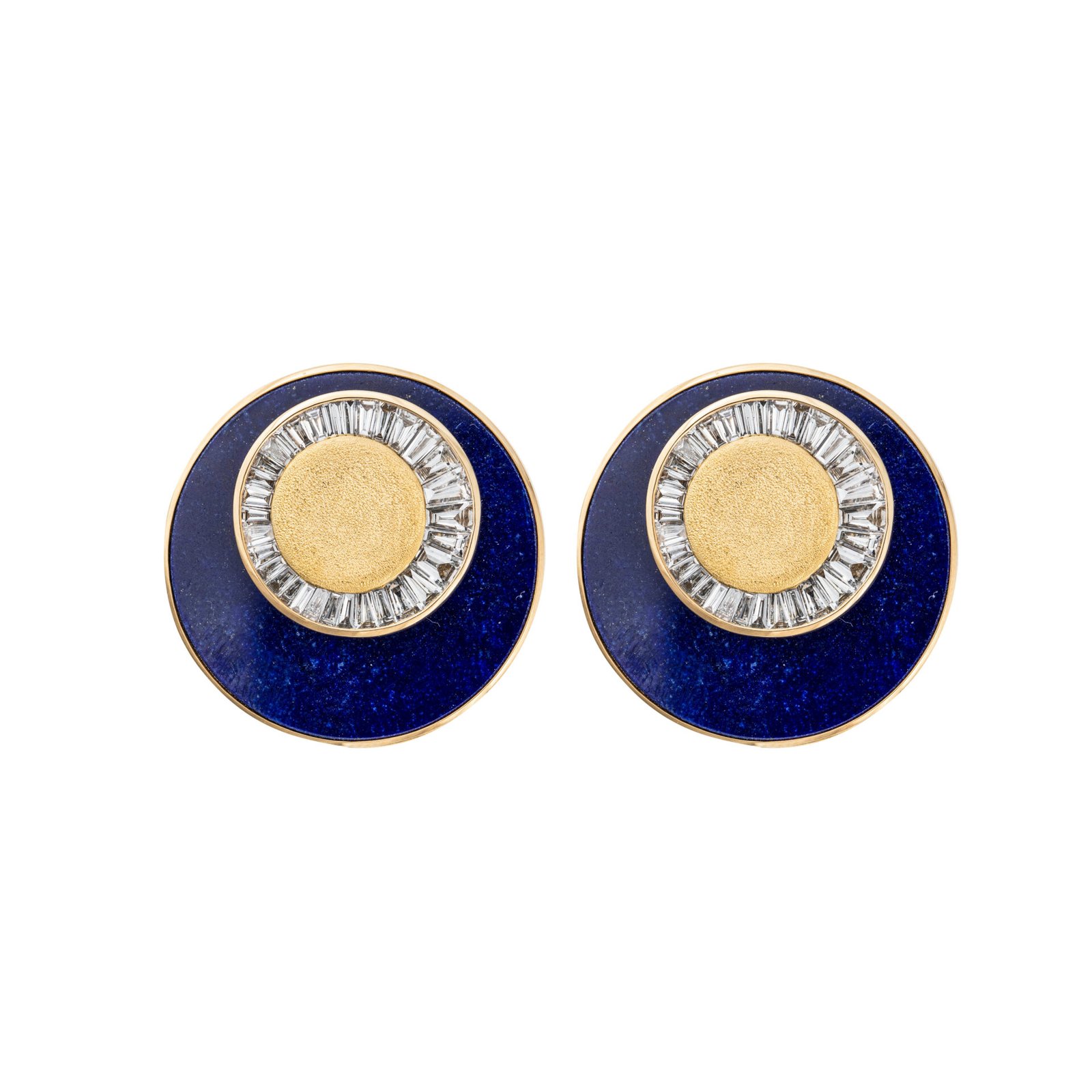 The 18K Yellow Gold Lapis Lazuli and Baguette Diamond Halo Sand Earring is a bold expression of colour and craftsmanship. Showcasing a deep blue lapis lazuli disc, the design is elevated by a radiant halo of baguette-cut diamonds encircling a sand-finished yellow gold centre. Crafted in luxurious 18K yellow gold, this striking circular earring blends modern elegance with timeless sophistication, making it a standout piece for refined everyday wear or statement styling.