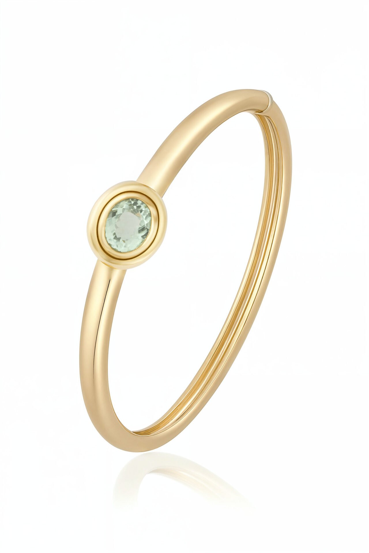 The 18K Yellow Gold Tourmaline Bangle features a refined open bangle design highlighted by a round-cut tourmaline set in polished 18K yellow gold. The smooth, minimalist silhouette enhances the natural green hue of the tourmaline, creating a sophisticated balance of modern elegance and timeless craftsmanship. A versatile piece designed for effortless everyday wear and elevated occasions.